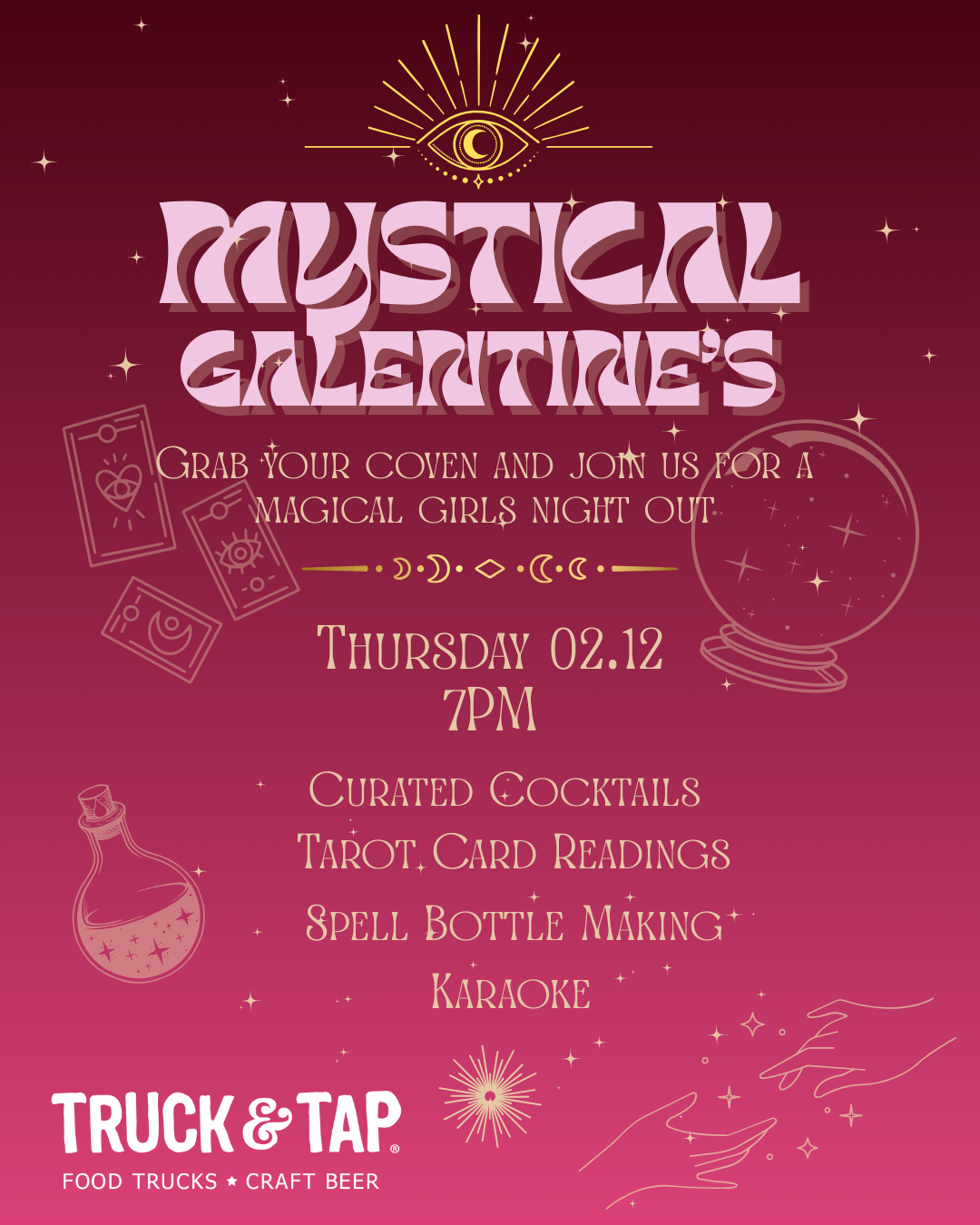 Feb 12 7:00 pm - 11:30 pm Mystical Galentine’s Night Truck & Tap (Duluth) 3137 Main Street, Duluth Event Details Get Directions