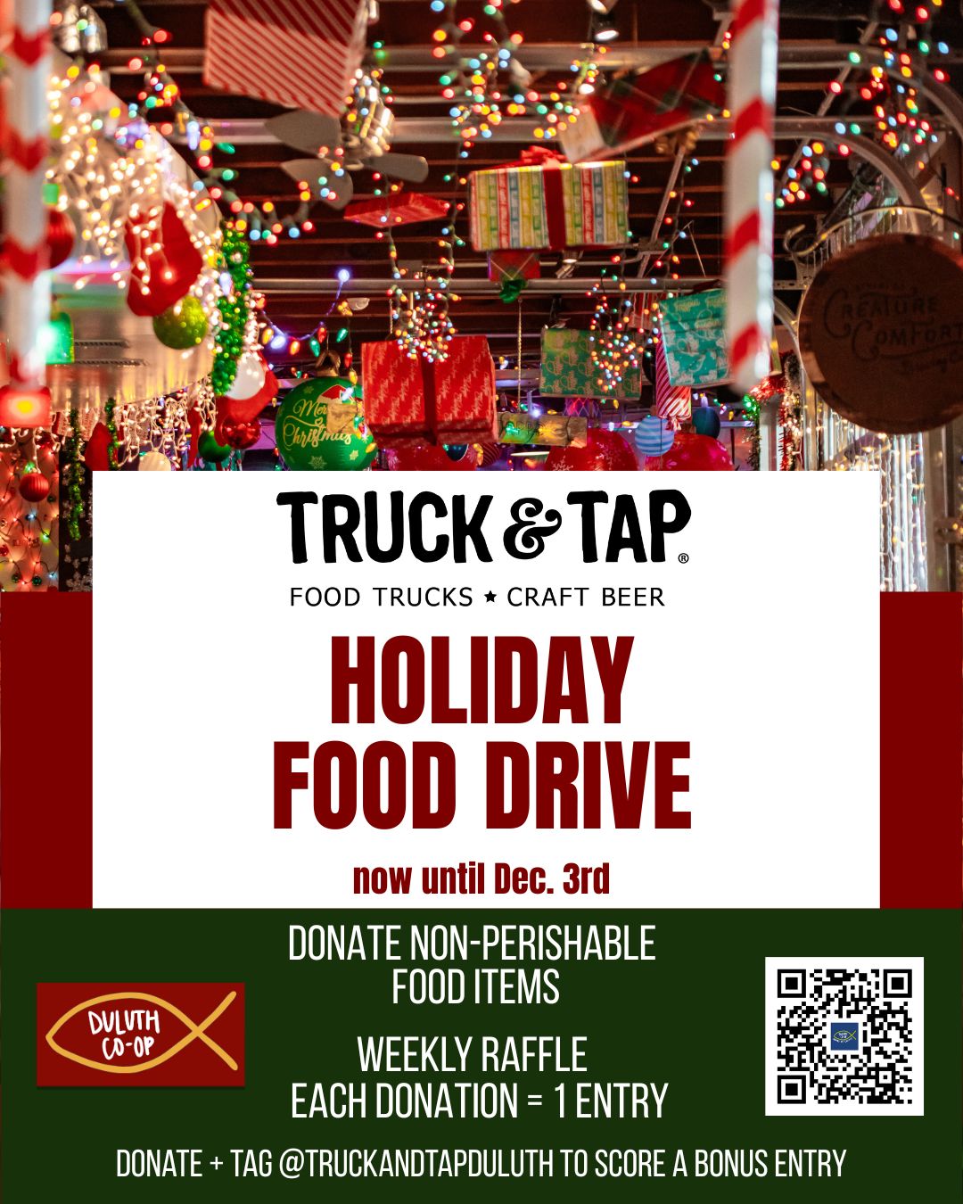 Nov 25 12:00 pm - 11:30 pm Event Series Holiday Food Drive benefiting the Duluth Co-op Truck & Tap (Duluth) 3137 Main Street, Duluth Event Details Get Directions