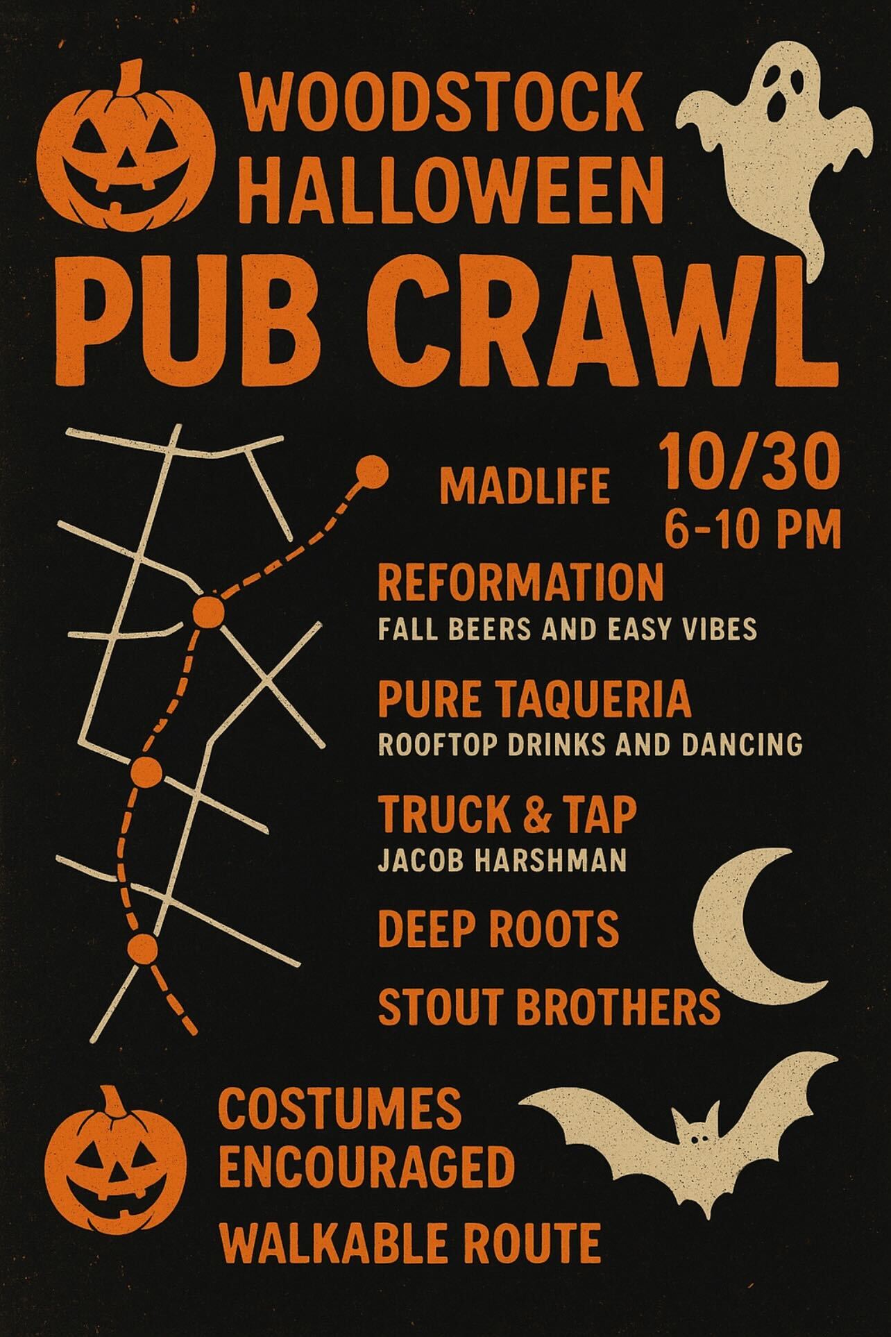 It’s boo-ze crawl season. Join us for the Woodstock Halloween Pub Crawl on 10/30 from 6–10 PM! We’ll be your last stop for live music from Jacob Harshman 7-10pm, cold craft brews, and spooky good vibes